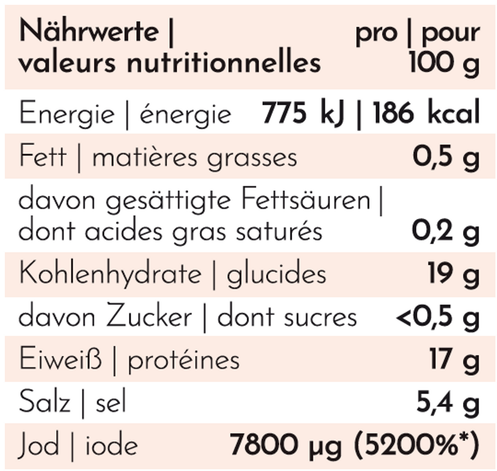Meerlattich* (Ulva sp.), Dulse* (Palmaria palmata) (in unterschiedlichen Gewichtsanteilen) *aus kontrolliert ökologischer Sammlung von Algen, geerntet im Nordostatlantik.