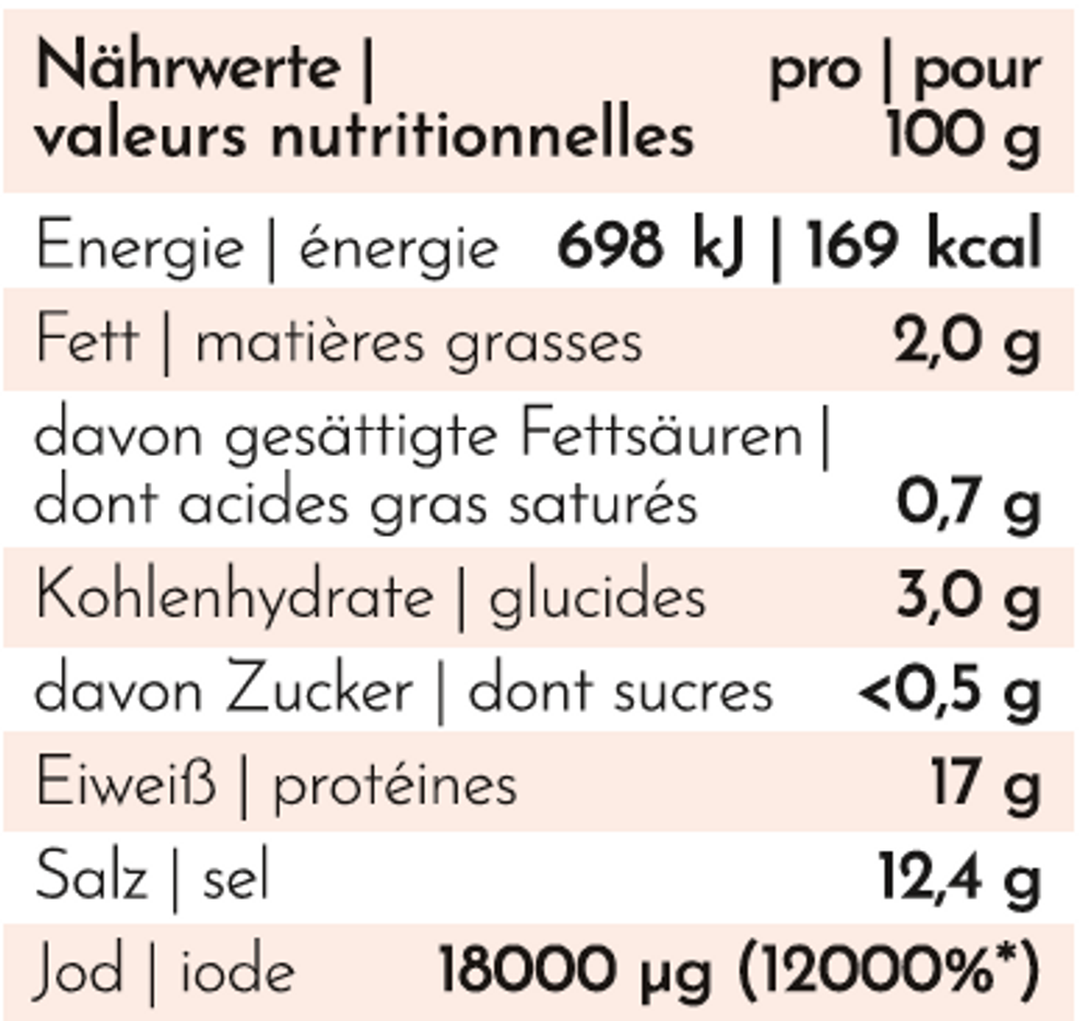 Hinweis: Aufgrund des Jodgehalts kann ein übermäßiger Verzehr von Algen zur Störung der Schilddrüsenfunktion führen. Nicht mehr als 1 g = 1 TL Wakame (getrocknet) pro Tag verzehren. Die Zubereitungsempfehlung unbedingt beachten.